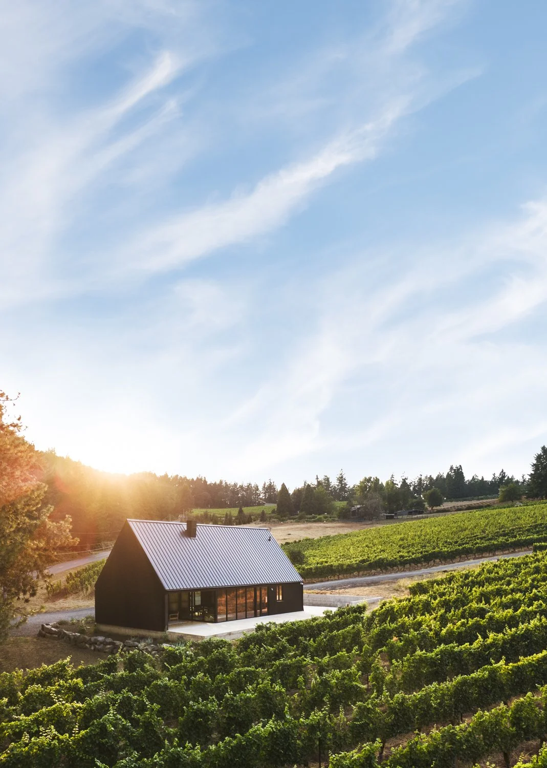 “The tasting room at Woodshed Wine Company is a modest structure inspired by the surrounding agricultural architecture and the music and imagery of the client’s favorite band, The National. Through the use of simple forms and honest material expression, the design elevates the woodshed into a refined and inspiring work of architecture. The subdued and melancholic mood of The National’s music, along with the cover art from their album ‘Sleep Well Beast’, provided additional avenues for design exploration. Situated at the base of the surrounding hills, the building’s location and orientation respond to the rolling topography of the vineyards, offering curated views that evolve with the seasons.”